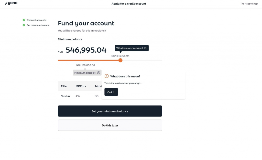 You can deposit less than the recommended  amount into your minimum balance. However, it would reduce your credit limit. You can also not have a minimum balance less than 150,000 Nigerian Naira as our lowest credit limit is 1 million Nigerian Naira. Once you complete your deposit, your credit account is opened and active. Voila! Time to do transactions.