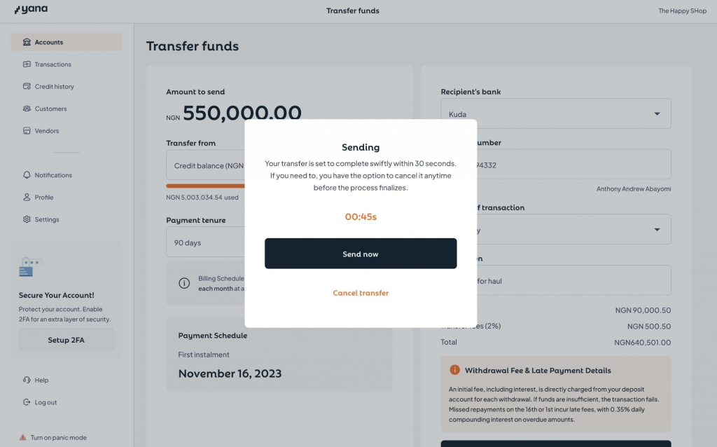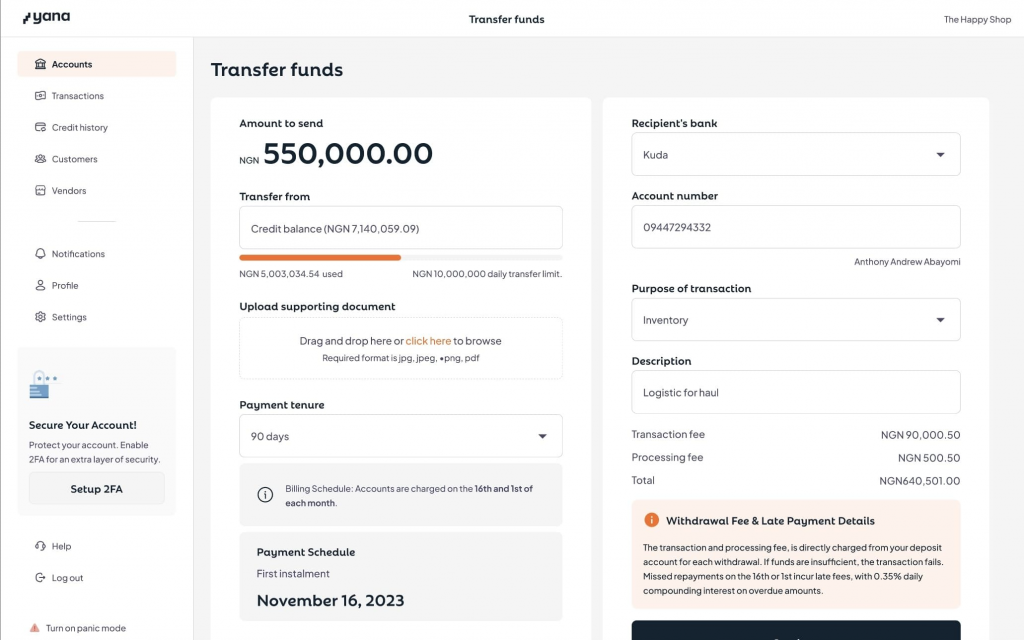 Yana credit account is a sustainable financing option for your business. We designed it so that you never run out of funds on rainy days or to step into your next level of growth!